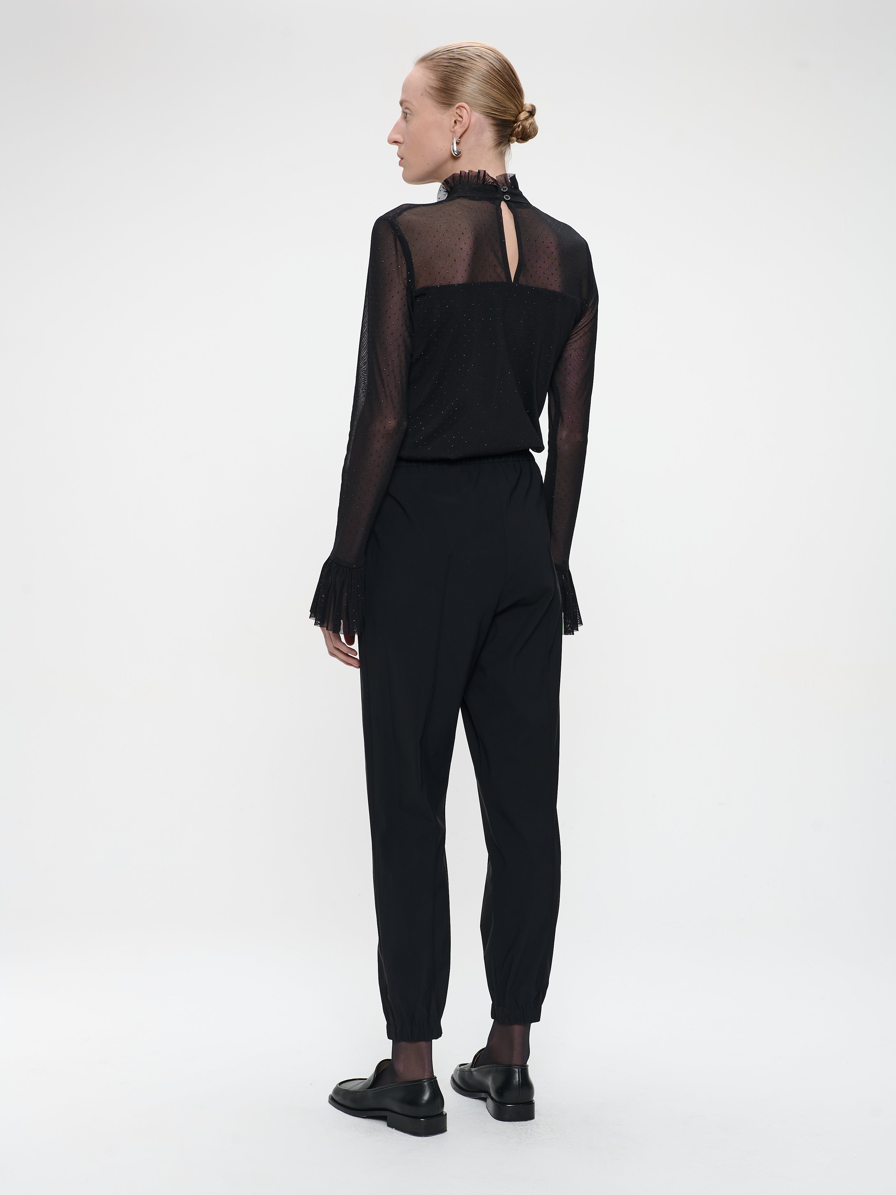 A true show-stopper, the Inn mesh top is designed to add a touch of drama to your everyday wardrobe. Crafted from a fine mesh jersey with delicate polka dots, it features sheer long sleeves and a semi-transparent yoke that brings an element of refined seduction. The lettuce-edge collar and cuffs add feminine flair, making this top perfect for layering or wearing solo on a night out.