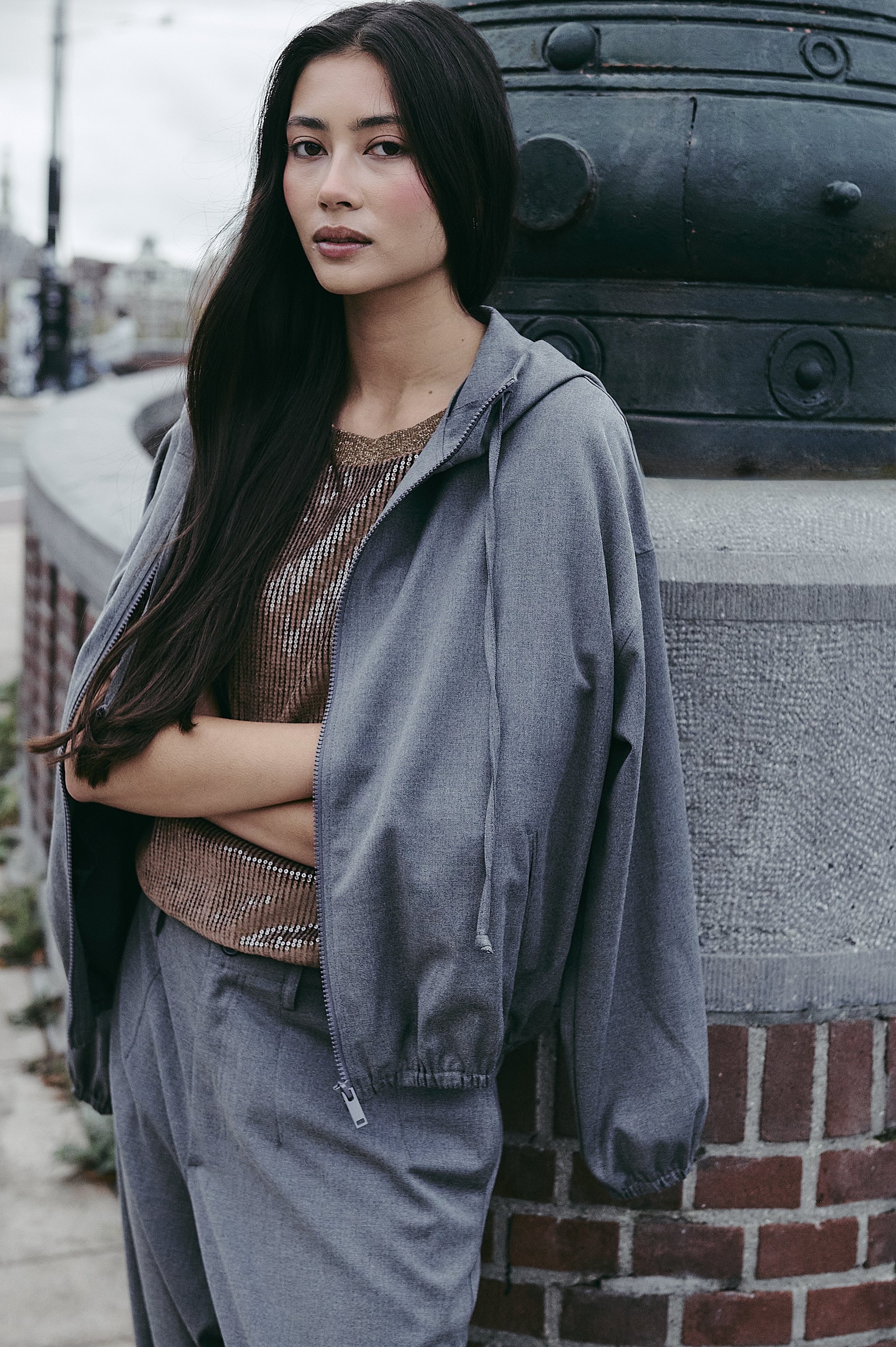 Designed for comfort and modern versatility, the Melissa top is a sleek essential for transitional weather. Made from brushed technical jersey with a soft interior finish, this top features a zipped V-neckline and a relaxed hood for a sporty yet elegant vibe. Perfect for layering or wearing on its own, it adapts easily to active or casual days.