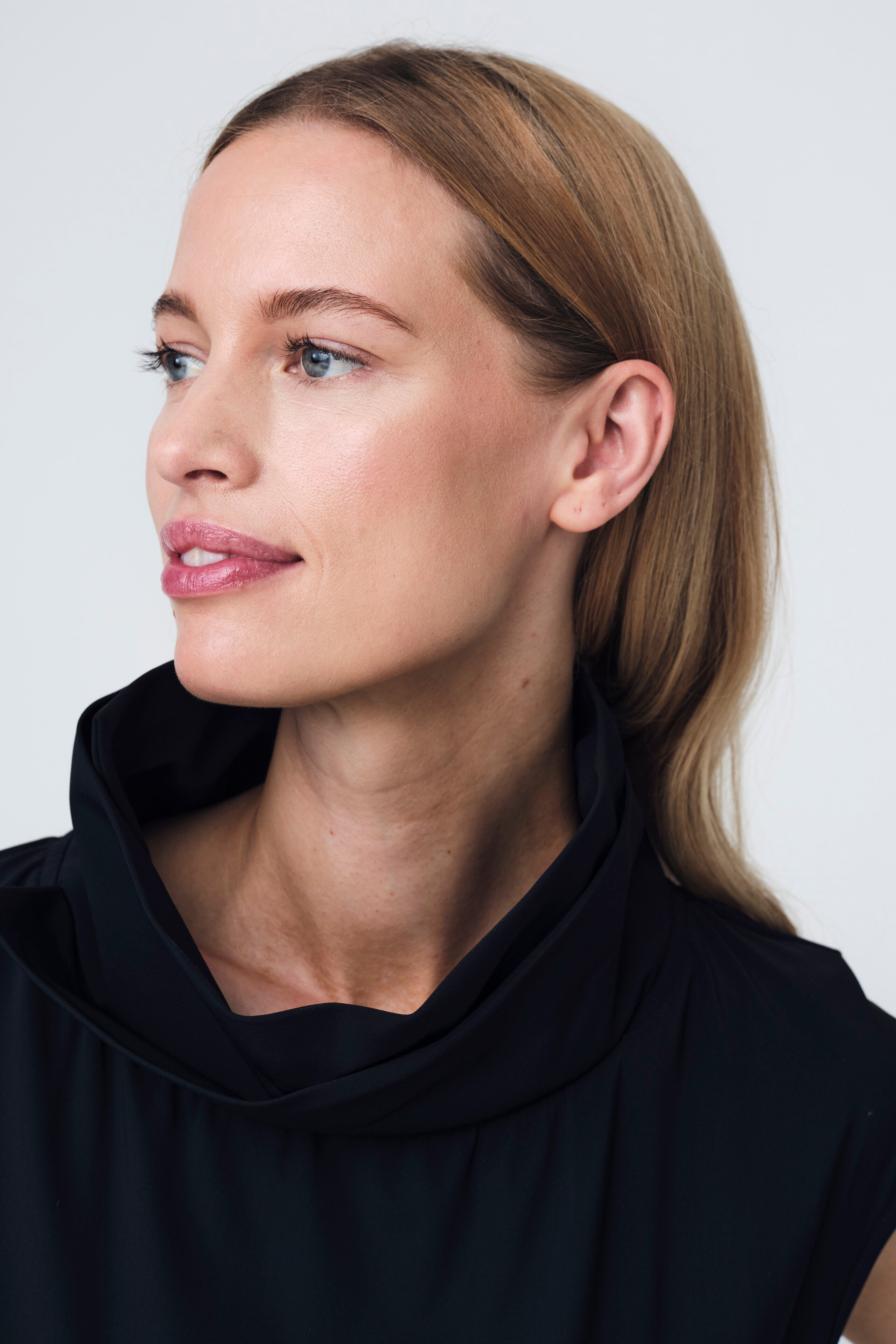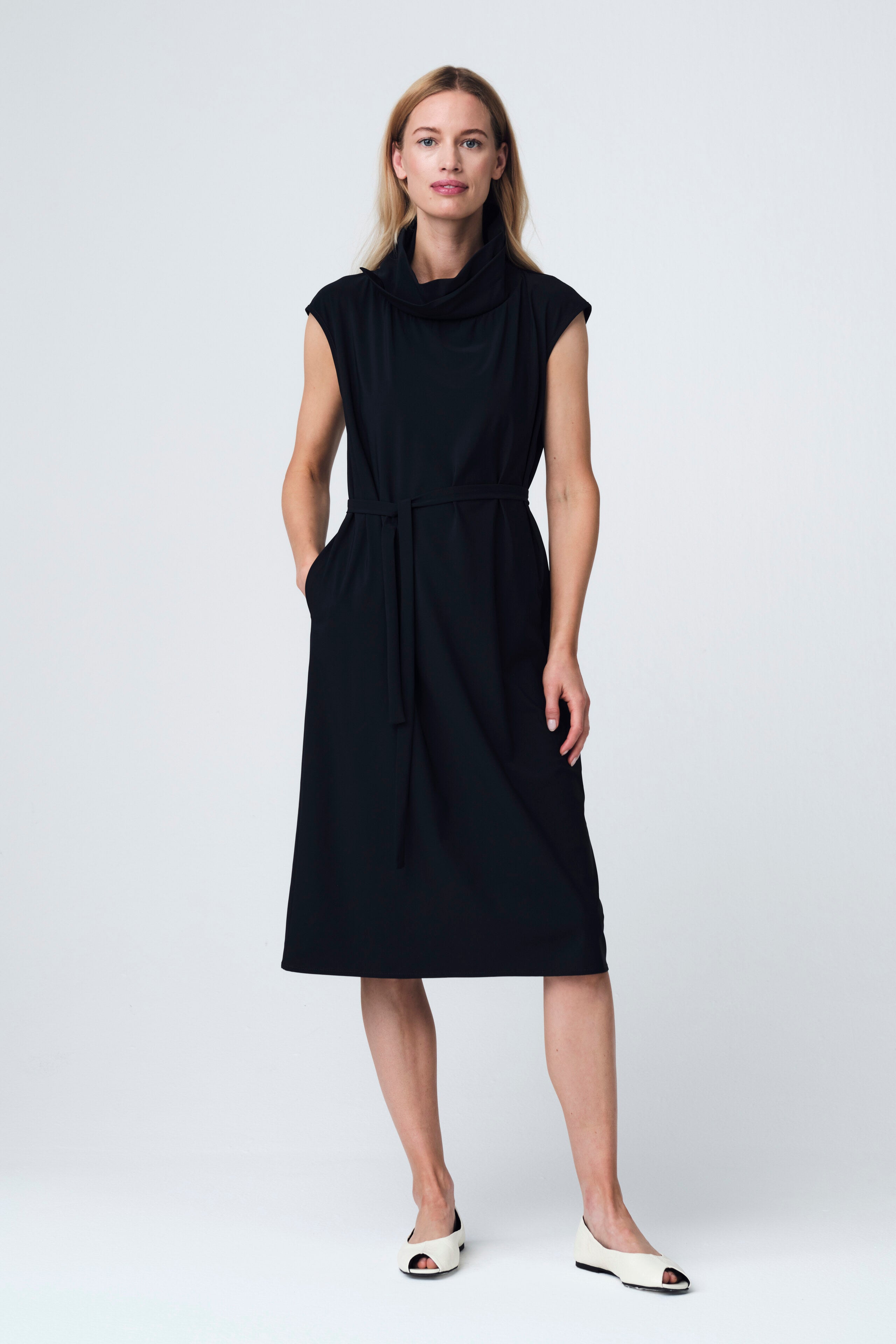 The Melva Dress combines clean lines with a modern, structured feel. Crafted in Europe from lightweight technical jersey, it features a smooth round neckline and softly extended shoulders for a refined silhouette. The subtly shaped waist provides gentle definition without restricting movement, while the midi length and fluid drape create an elegant, effortless look. Side pockets add practicality, making this dress ideal for everyday sophistication.