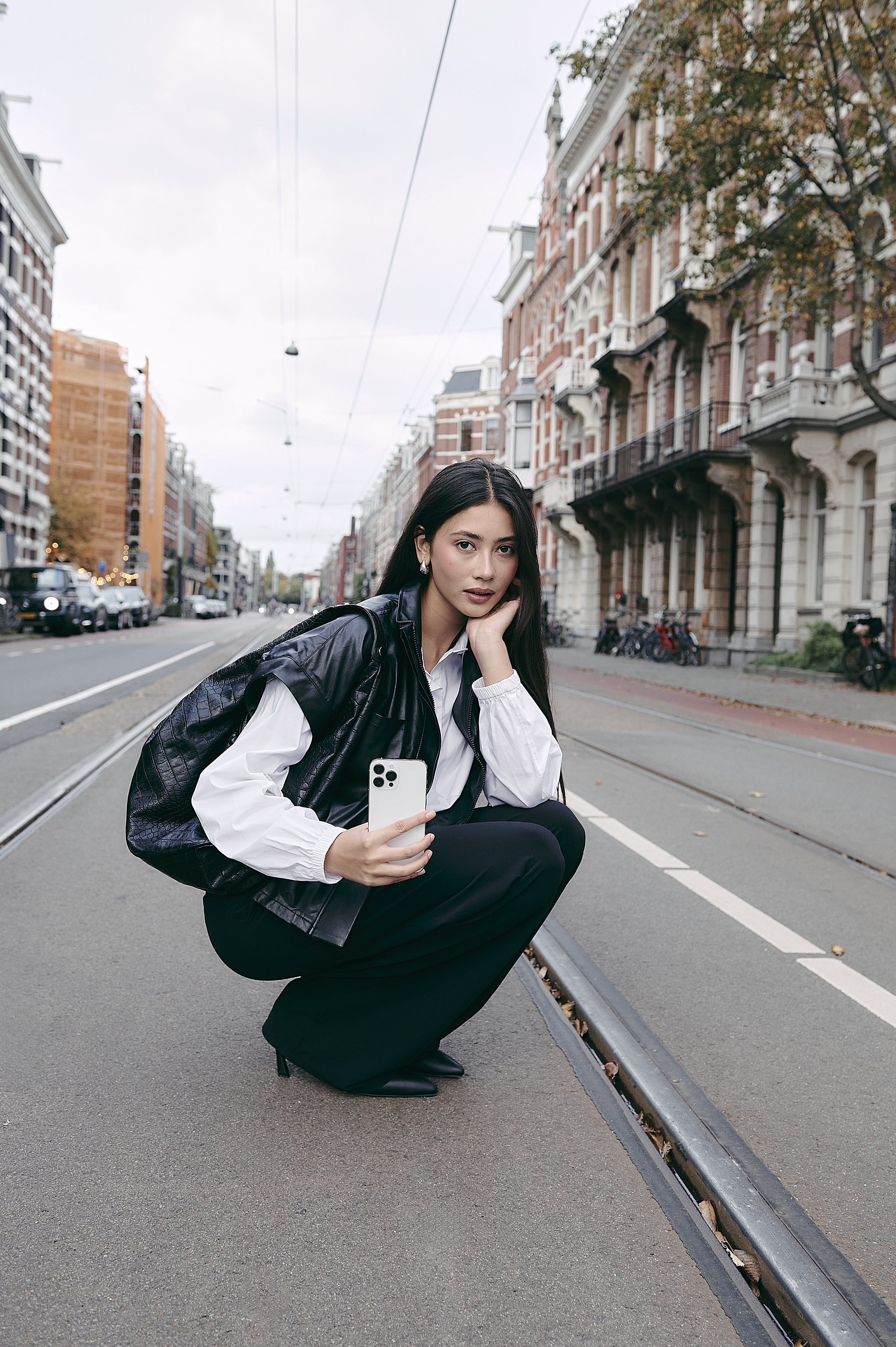 Add bold edge to your wardrobe with the Paola Eco Leather Blouse. This sleeveless design features a high stand collar, snap-button front, and a subtle boxy silhouette. Crafted from soft eco leather (100% viscose base), it delivers both structure and ease. Layered or worn solo, this piece brings a modern touch to casual or dressy looks.