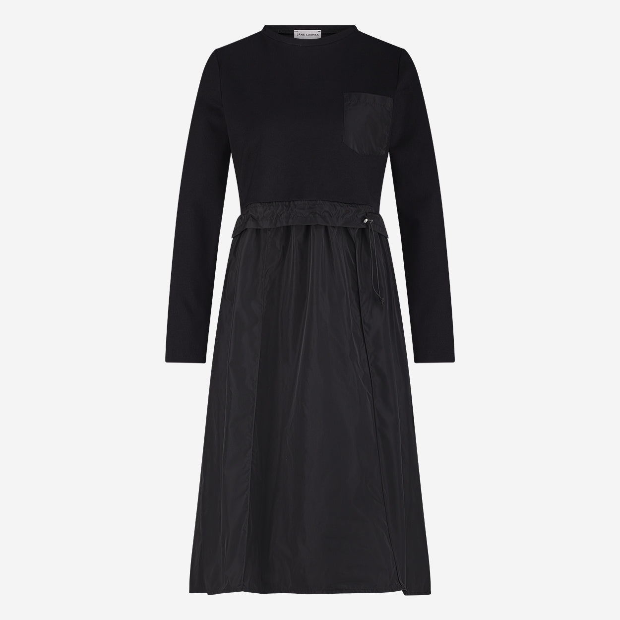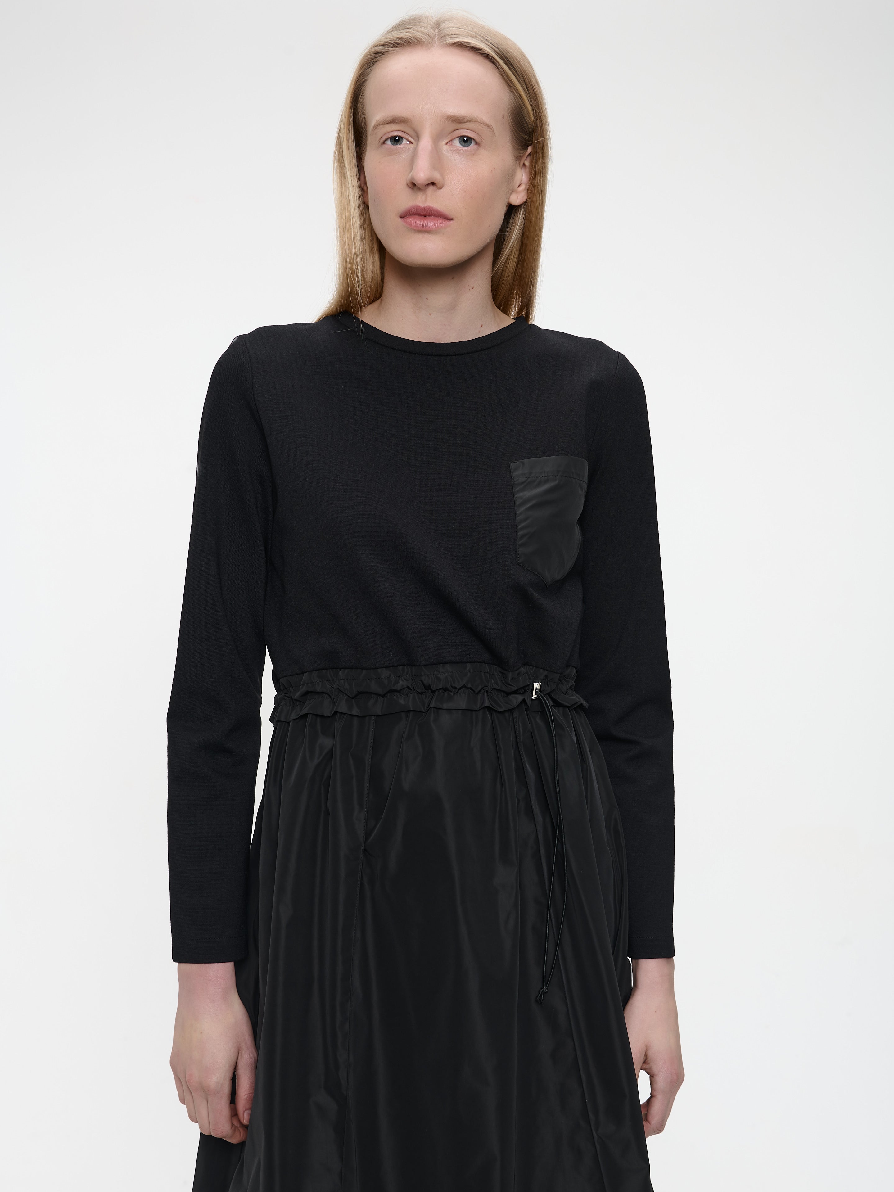 Blending texture and structure, the Ester Mix Cotton Taffeta Dress offers a fresh take on daywear. The upper part features a soft viscose-blend jersey, while the skirt is crafted from lightweight taffeta that adds subtle volume and sheen. A braided waistband and tonal chest pocket complete the look — stylish and effortless for both casual outings and polished settings.