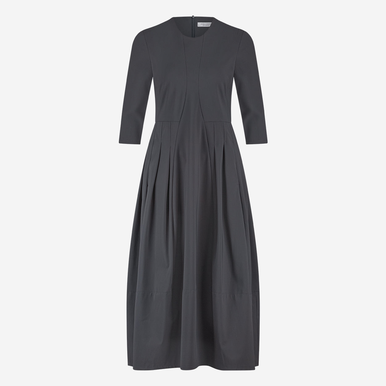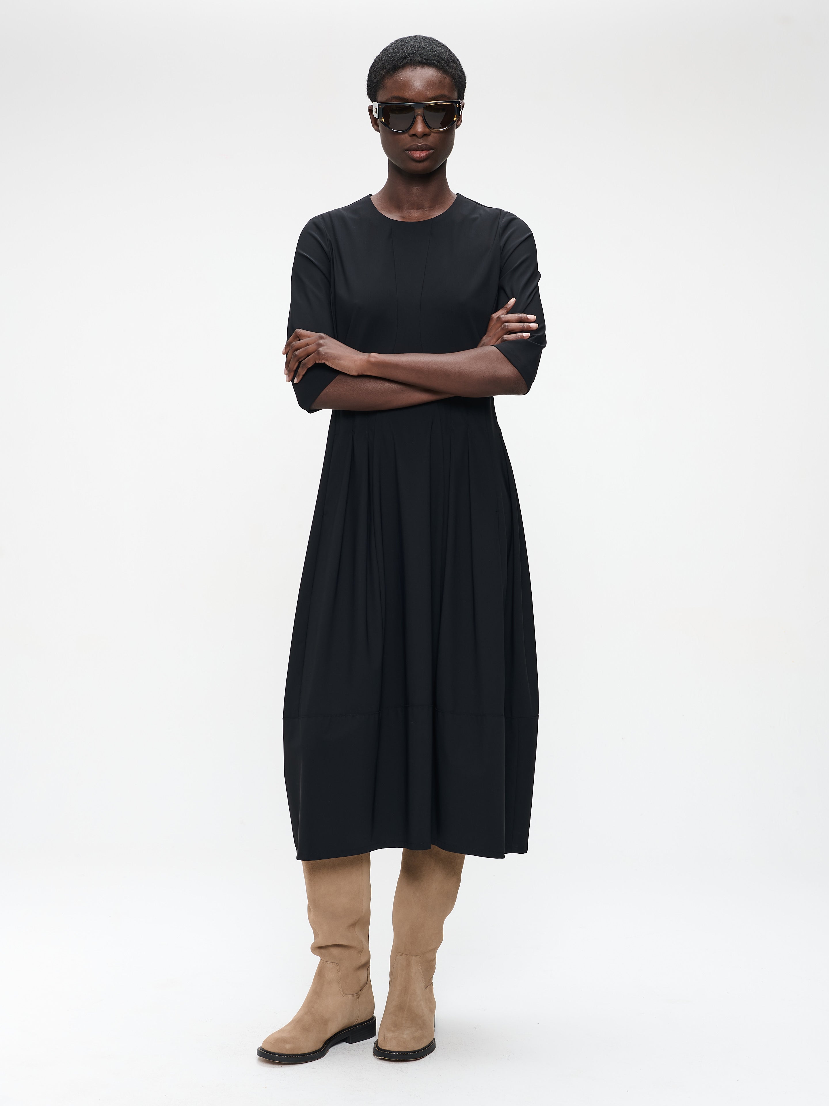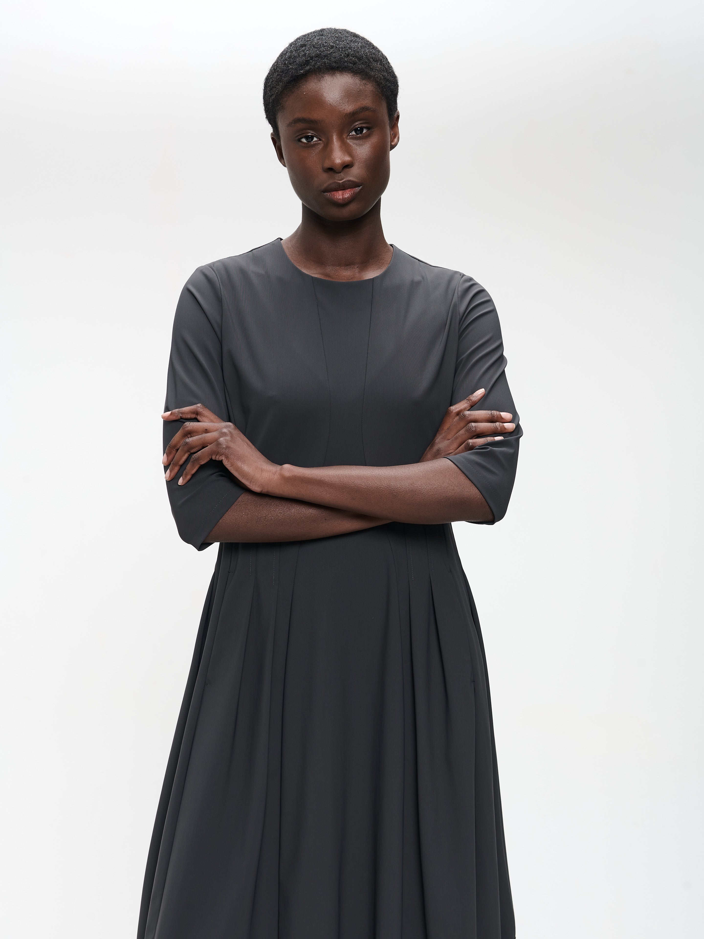 Elegant in its simplicity, the Heide Dress features a sleeveless silhouette with a round neckline and soft pleats that fall gracefully from the waist. Crafted from technical jersey, it offers fluid movement and everyday comfort while retaining a refined structure. The midi length and timeless shape make it perfect for both casual sophistication and elevated layering.