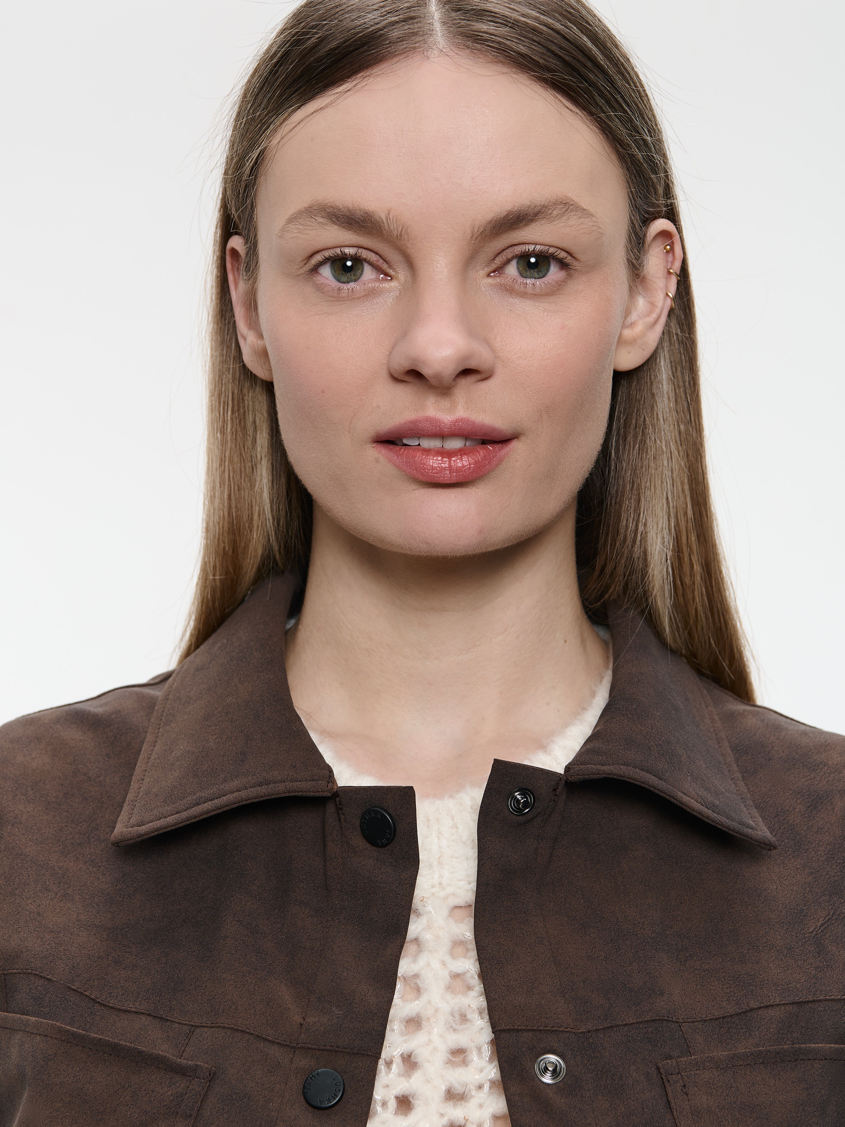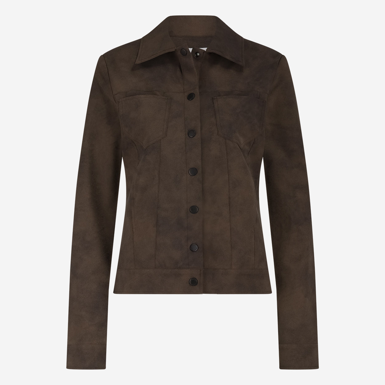 The Riva jacket (UL1251950) reimagines a classic trucker silhouette in soft, stretchy technical jersey with a suede-like finish. Featuring a button-up front, shirt collar, and single chest pocket, it delivers a smart casual look with elevated texture. The rich brown tone adds warmth and versatility, making it an ideal piece for autumn styling — whether worn as a set or mixed with knits and denim.
