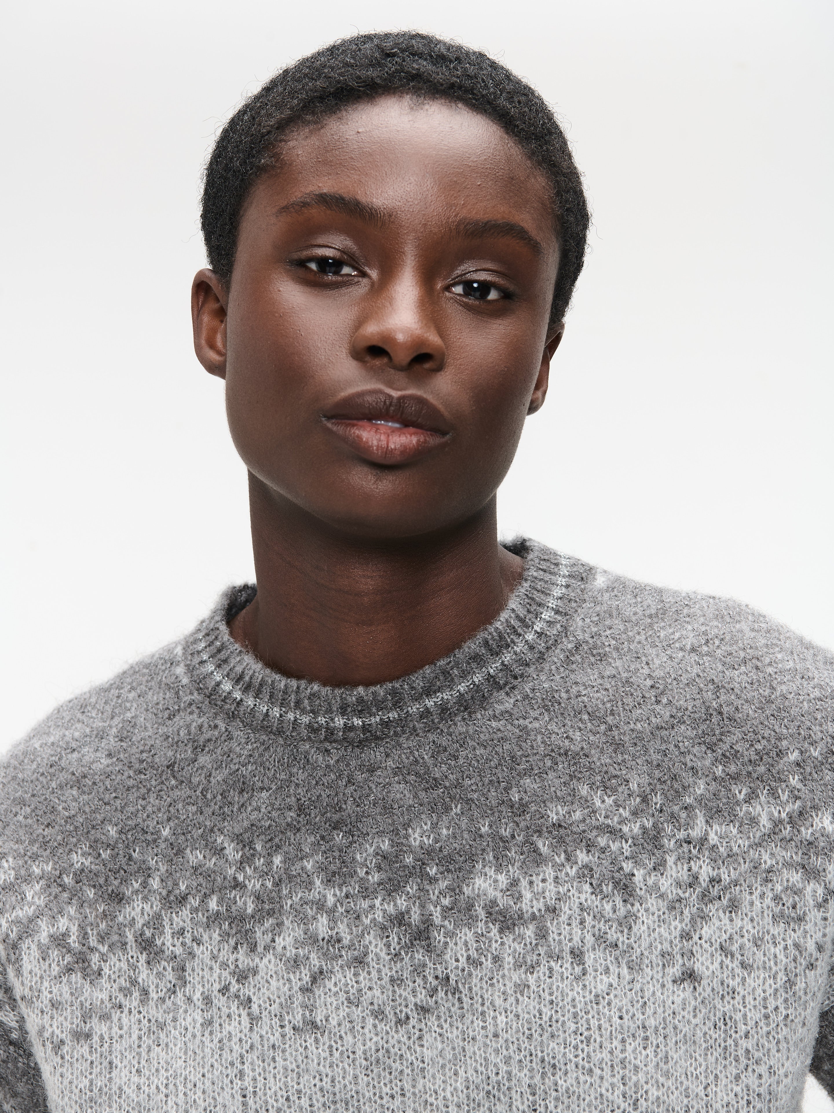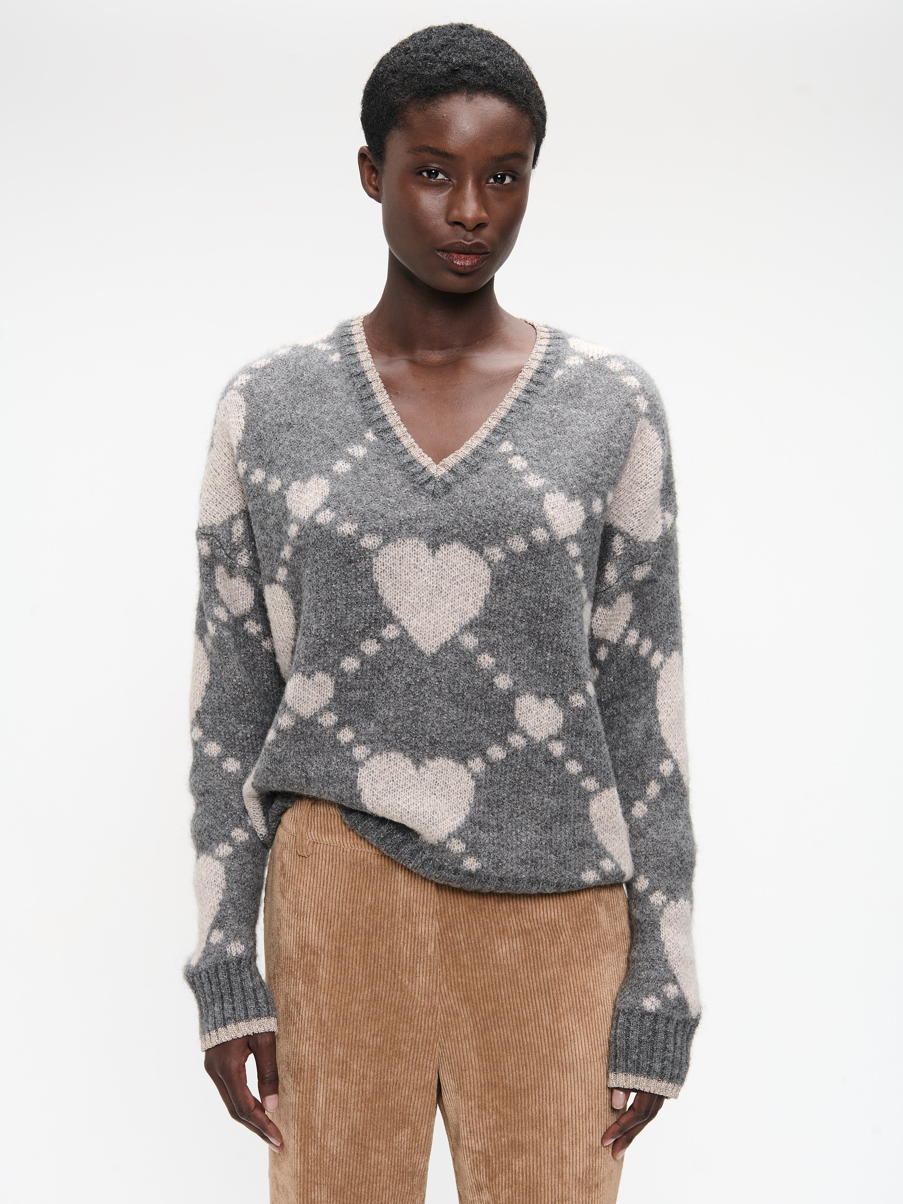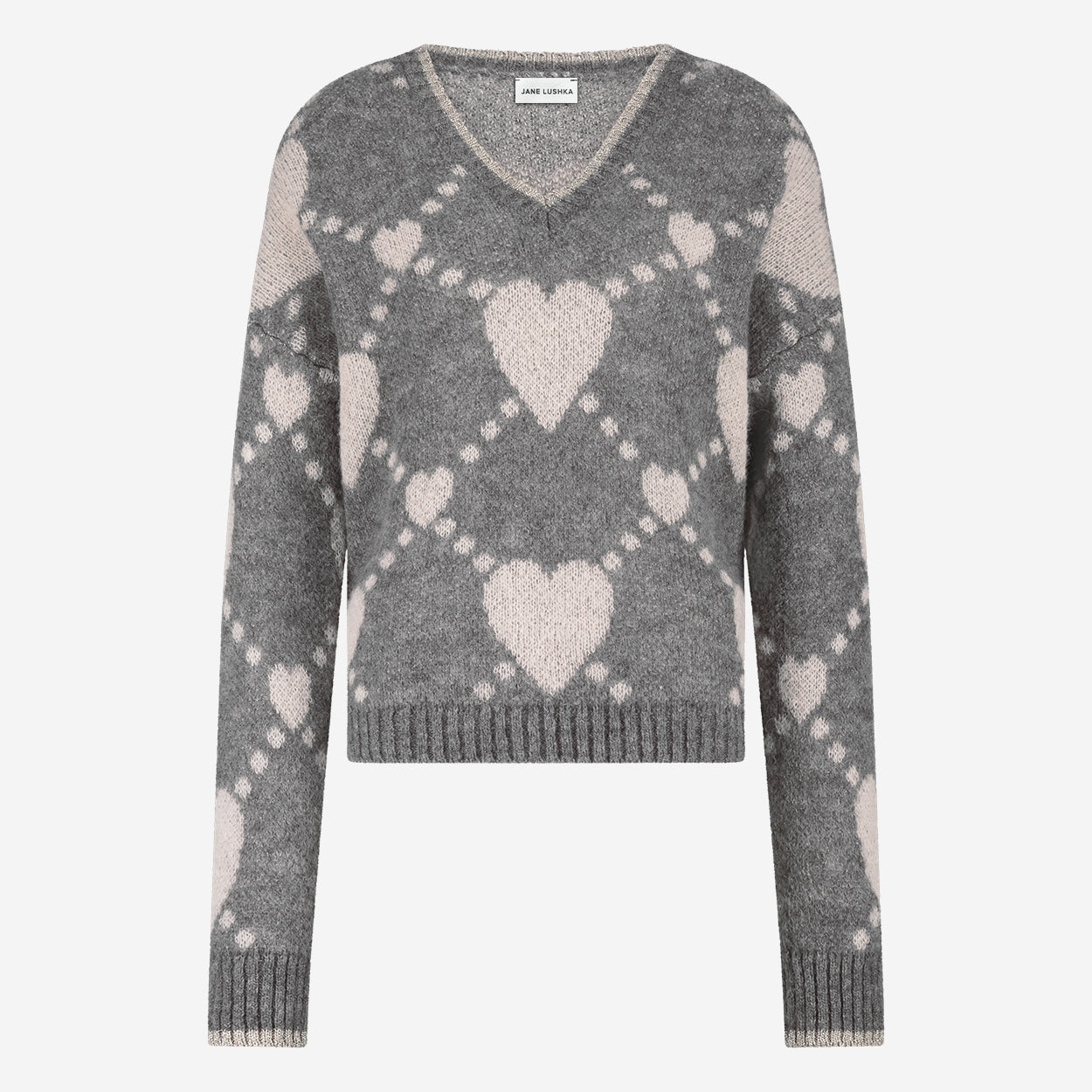 Fall for the charm of the Hearts Pullover H23379 – a cozy knitwear piece that brings playful romance to your wardrobe. With its soft heart pattern in a classic grey palette, this pullover adds a whimsical twist to everyday style. Designed with a relaxed silhouette and V-neckline, it’s perfect for layering over your favorite basics for a laid-back yet eye-catching look.