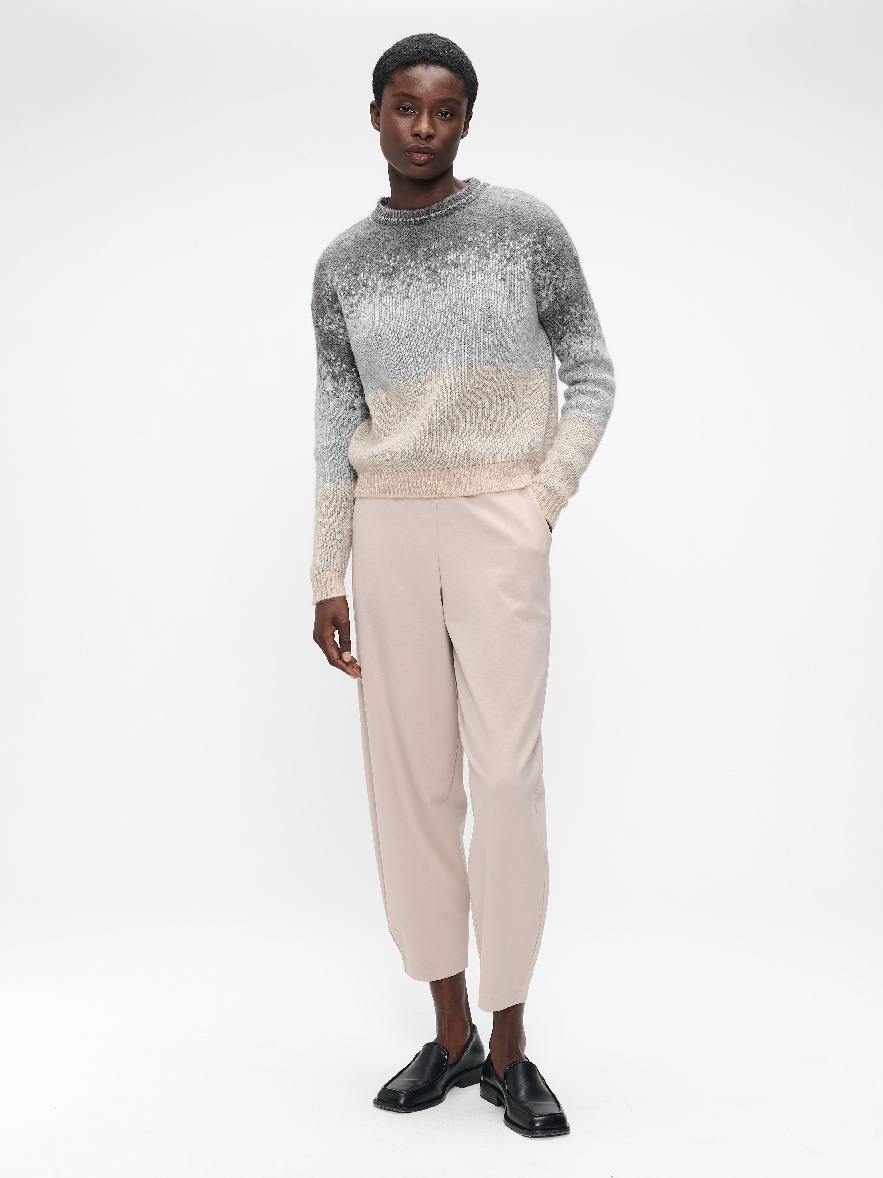 The Pullover shiny alpaca H24423 is an elegant knit that merges cozy comfort with a subtle sheen. Crafted in a soft and lightweight blend, this pullover stands out with its fine texture and versatile silhouette. The simple, round neckline and straight fit make it an ideal choice for effortless layering or standalone sophistication.