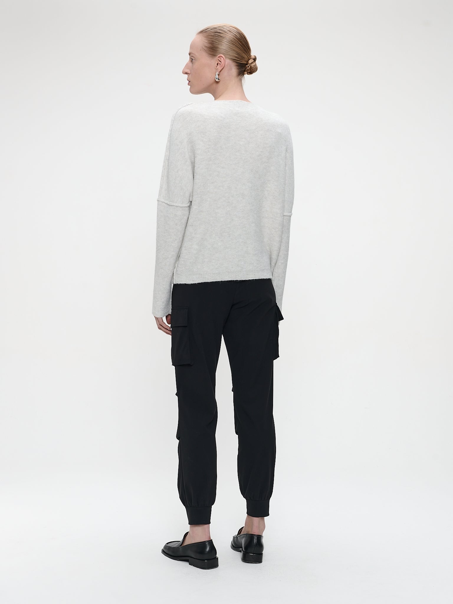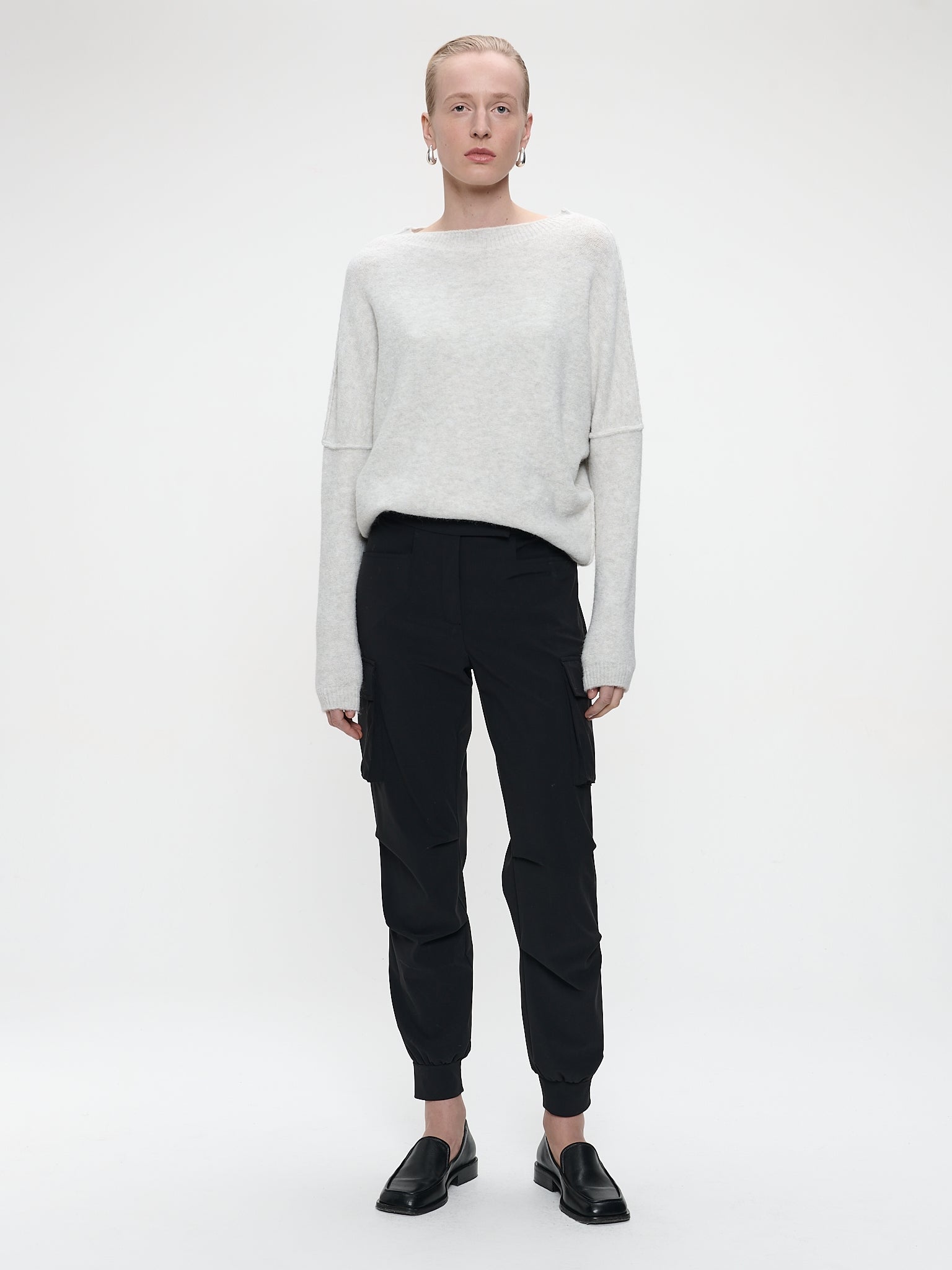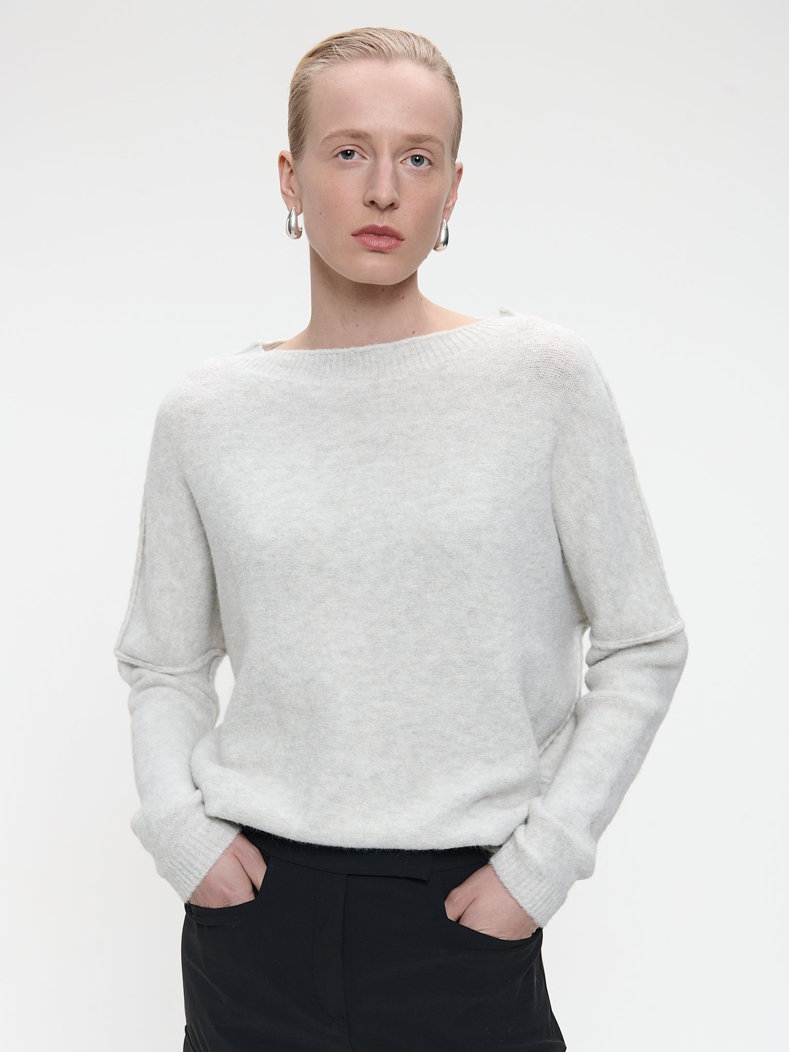 The Pullover shiny alpaca H24423 is an elegant knit that merges cozy comfort with a subtle sheen. Crafted in a soft and lightweight blend, this pullover stands out with its fine texture and versatile silhouette. The simple, round neckline and straight fit make it an ideal choice for effortless layering or standalone sophistication.