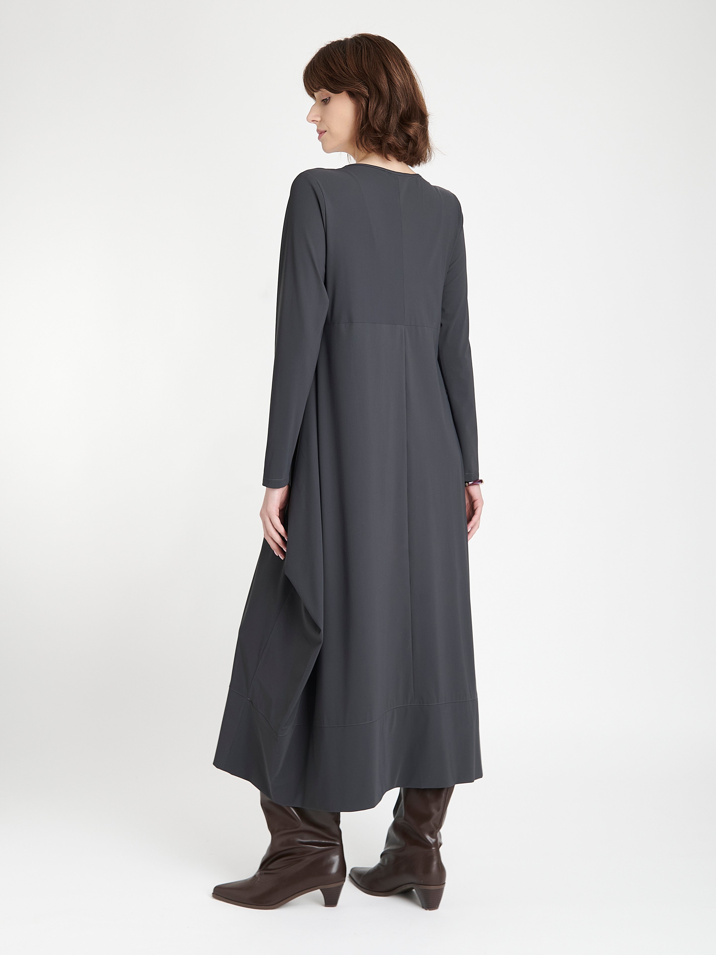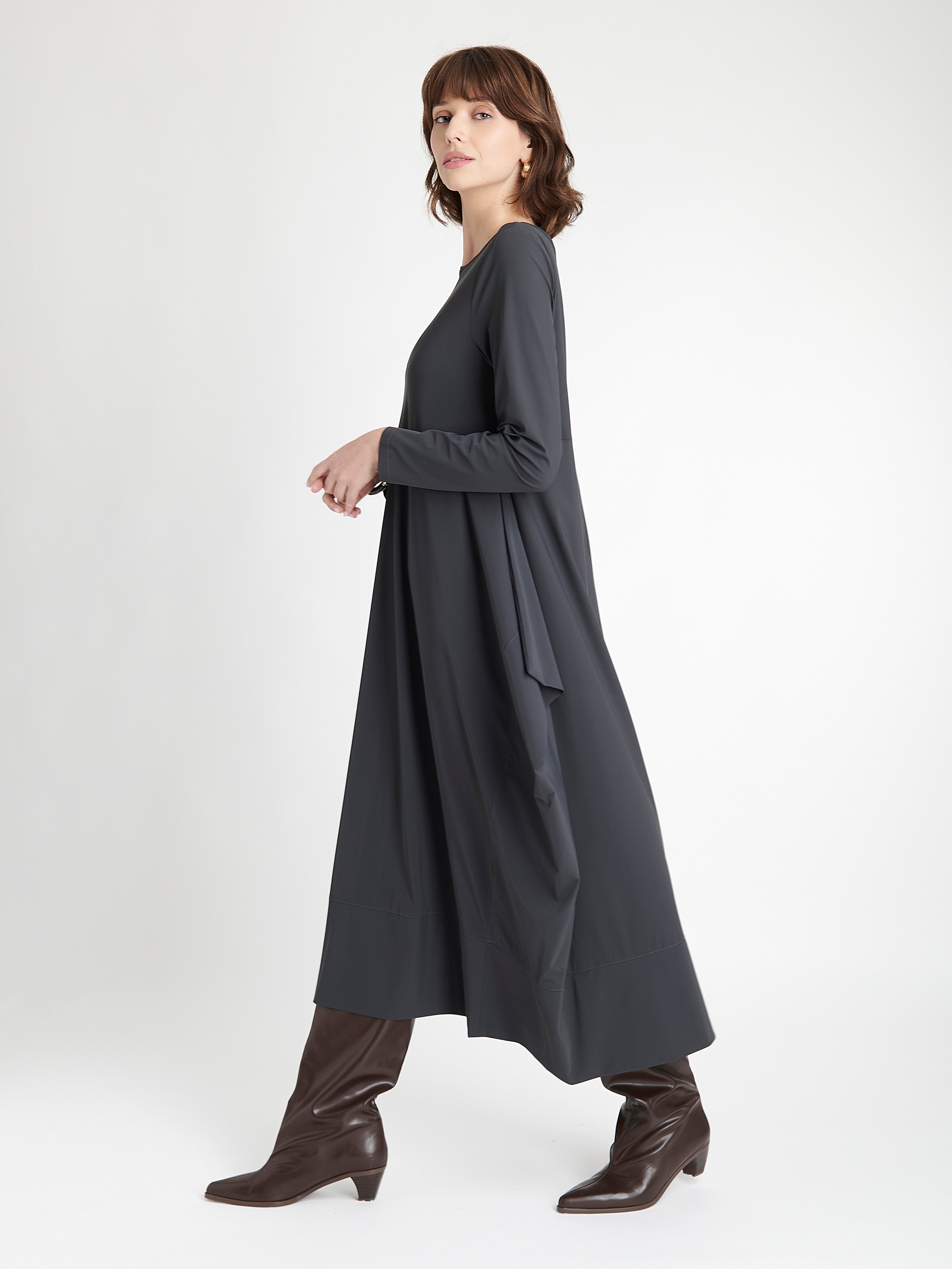The Isabel Dress LS is an effortlessly chic piece designed for modern elegance. Made from soft technical jersey, it drapes beautifully while providing gentle stretch for comfortable movement. The long-sleeve design features a flowing A-line silhouette with distinctive side drapes, creating a refined and flattering shape. Ideal for both daywear and evening occasions, this dress pairs timeless simplicity with an artistic edge.