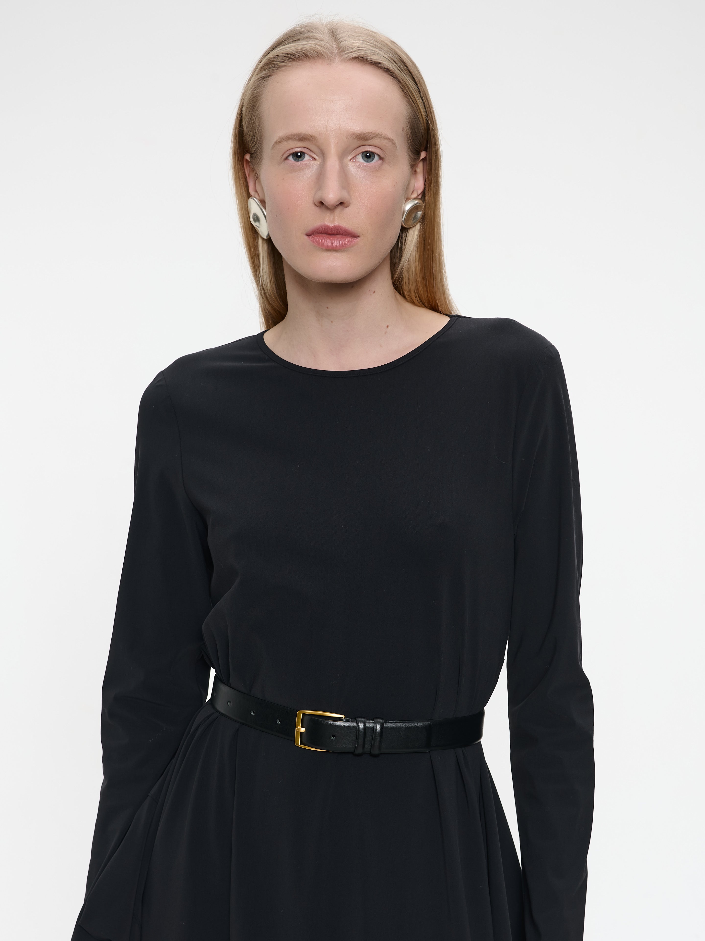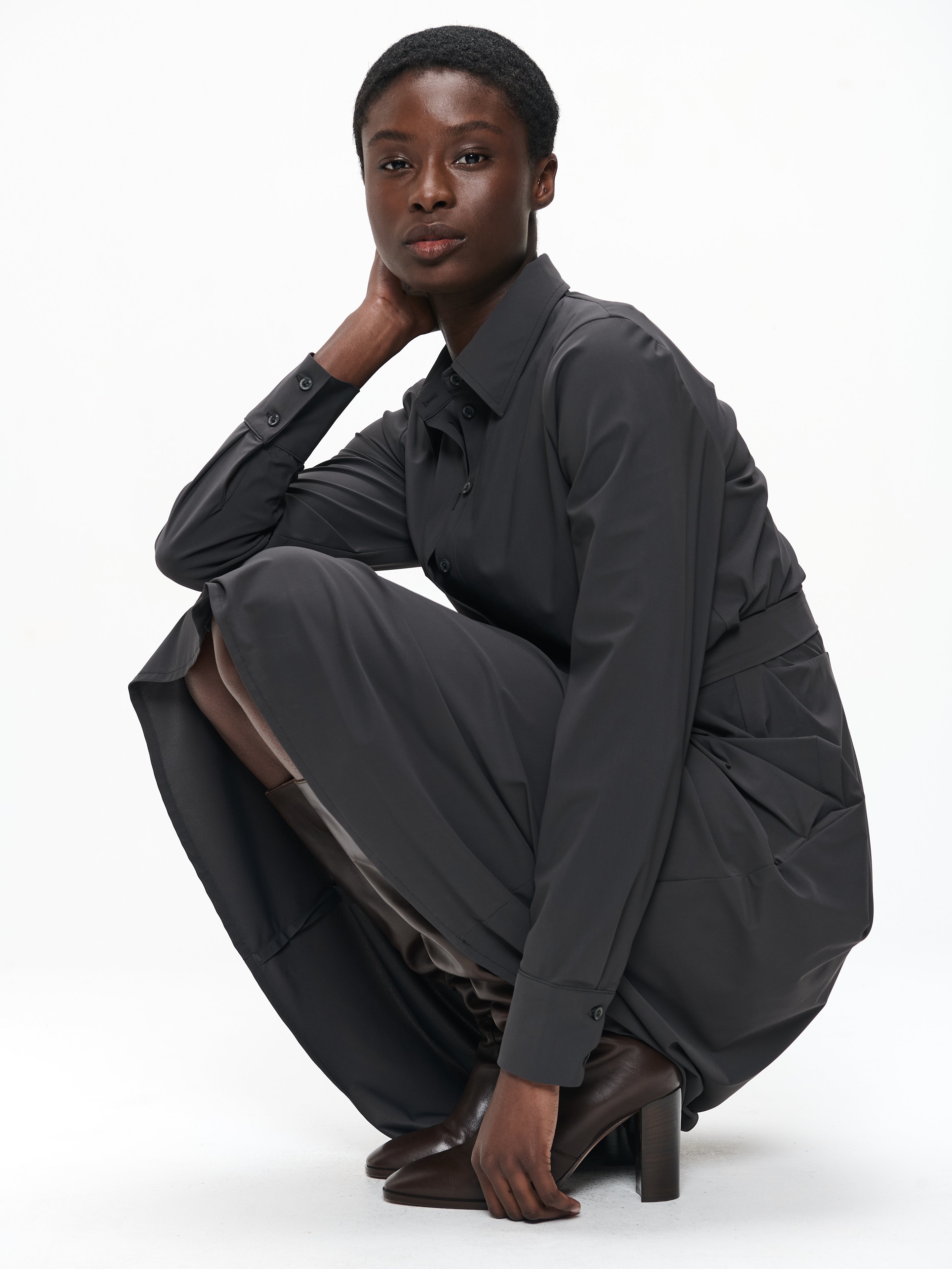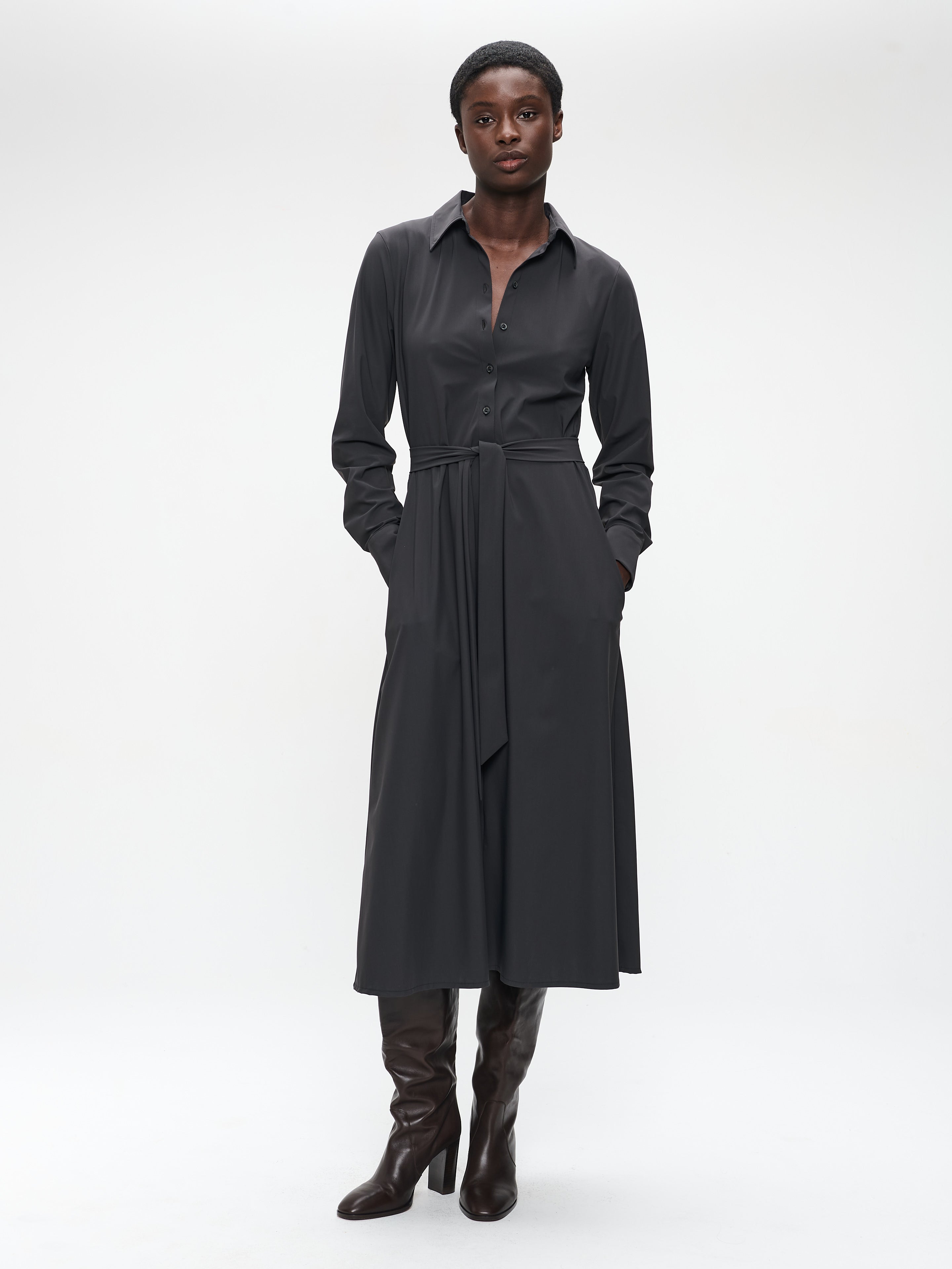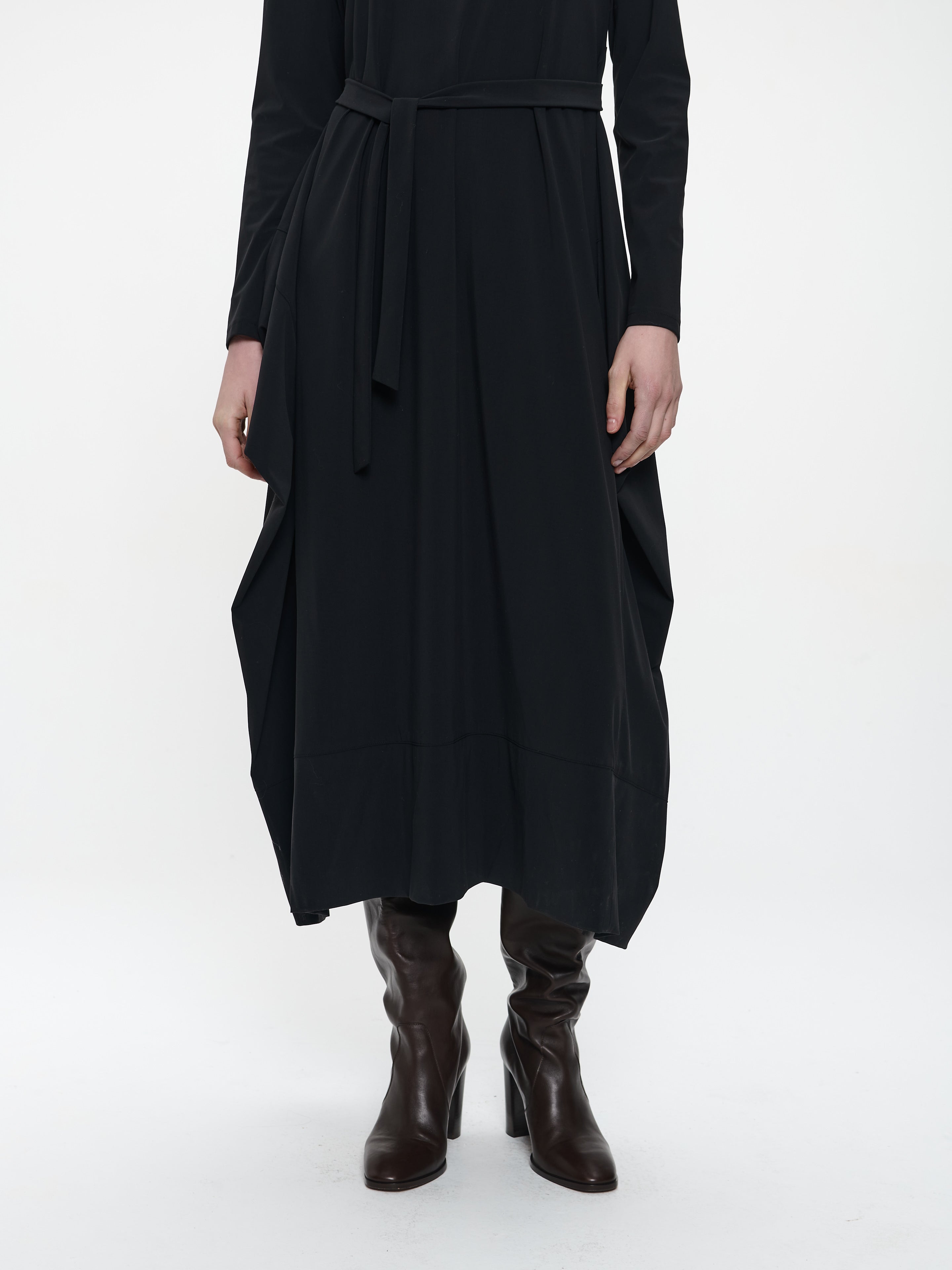 The Isabel Dress LS is an effortlessly chic piece designed for modern elegance. Made from soft technical jersey, it drapes beautifully while providing gentle stretch for comfortable movement. The long-sleeve design features a flowing A-line silhouette with distinctive side drapes, creating a refined and flattering shape. Ideal for both daywear and evening occasions, this dress pairs timeless simplicity with an artistic edge.