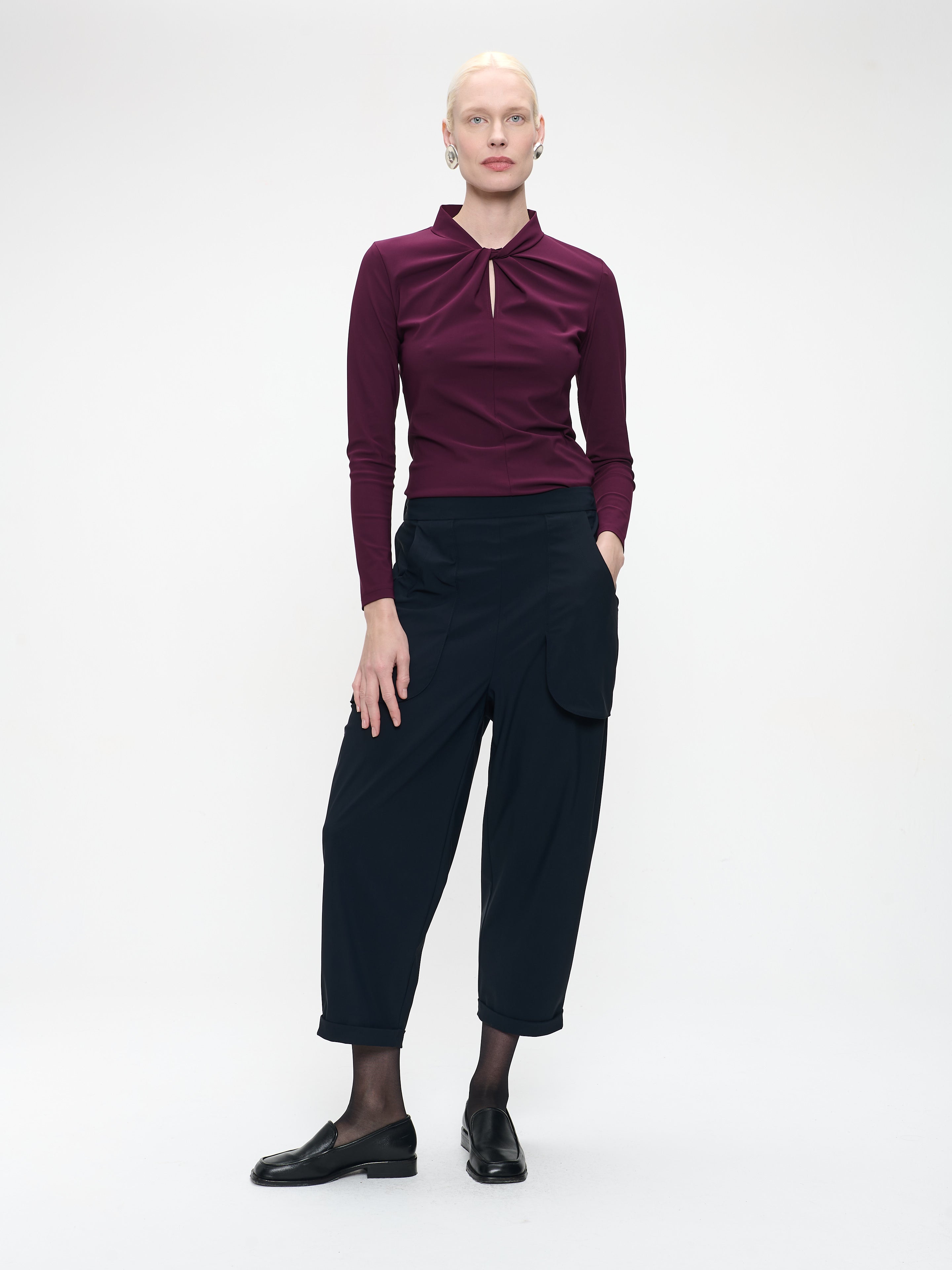 Refined and feminine, the Dolche Vita top elevates your everyday look with effortless sophistication. Crafted from high-quality technical jersey, this long-sleeved top features a soft stand-up collar with a draped detail that adds a contemporary edge. The slightly boxy silhouette ensures comfort while maintaining a modern aesthetic. Ideal for pairing with tailored trousers or casual separates.