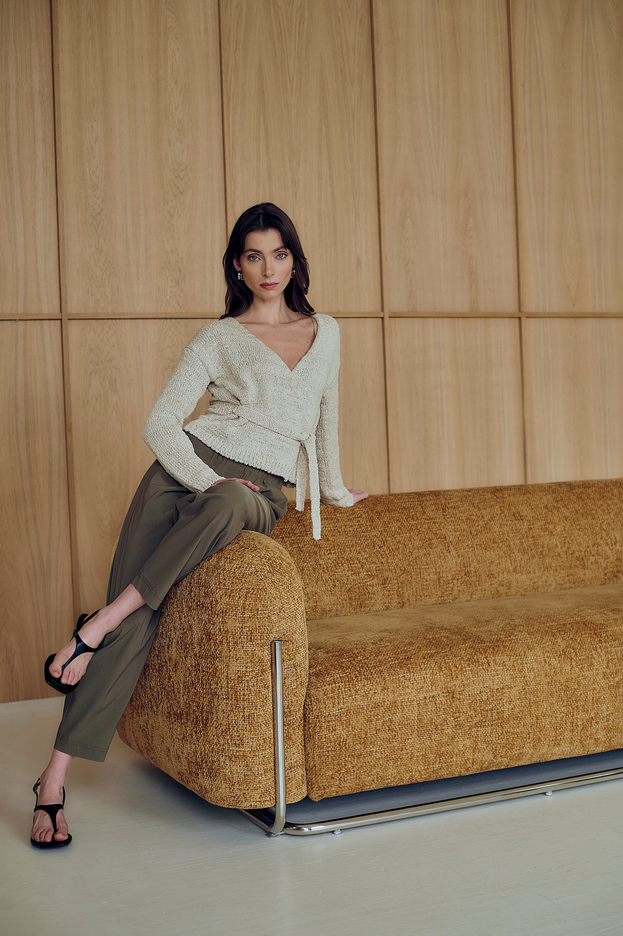 The Cardigan combines comfort and femininity in a refined design. Made in Europe from a soft cotton blend, this wrap-style cardigan features a deep V-neckline, a waist tie, and a slightly textured knit. Its flattering silhouette and natural tone make it a versatile choice for both casual and elegant looks.