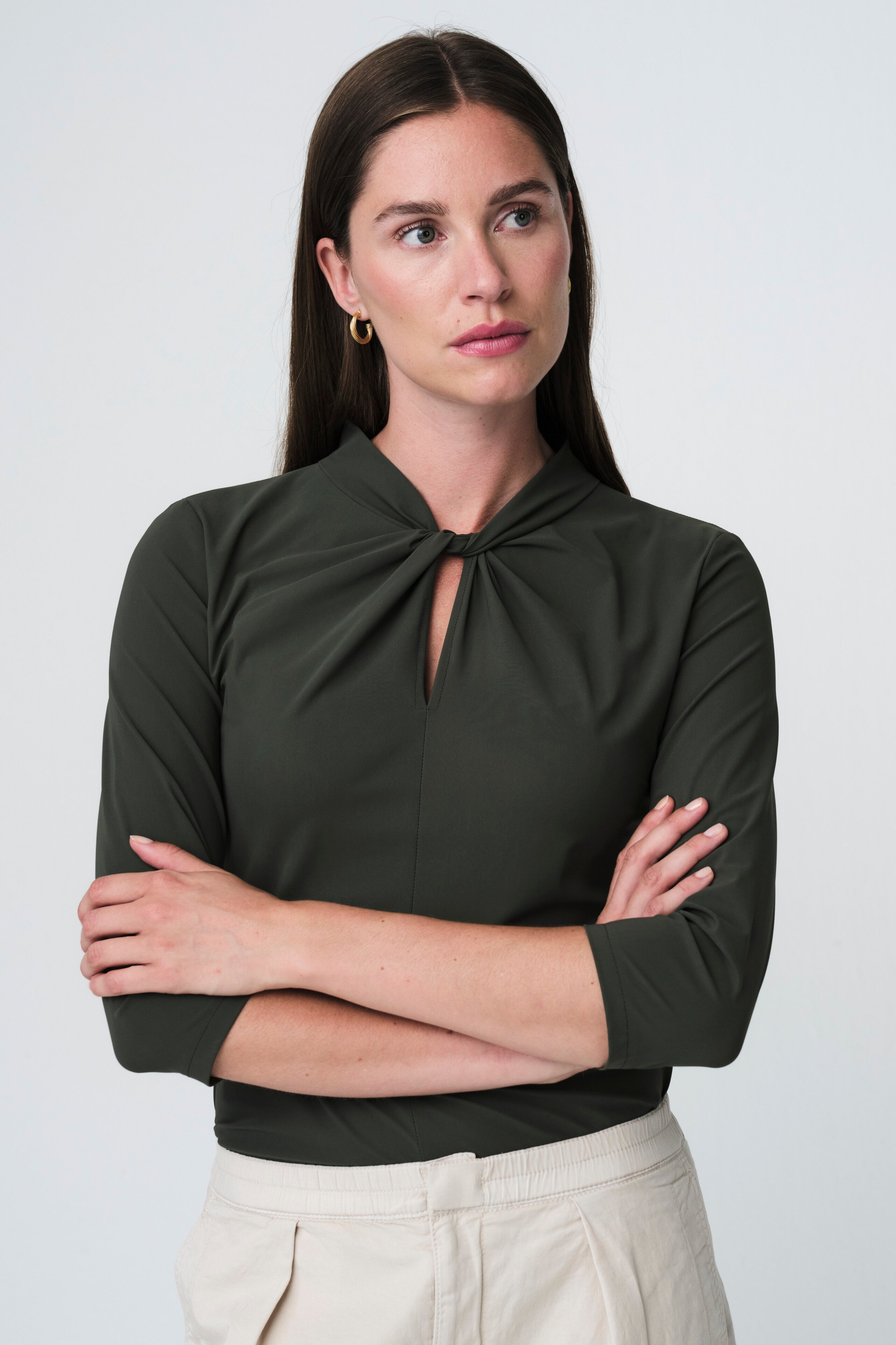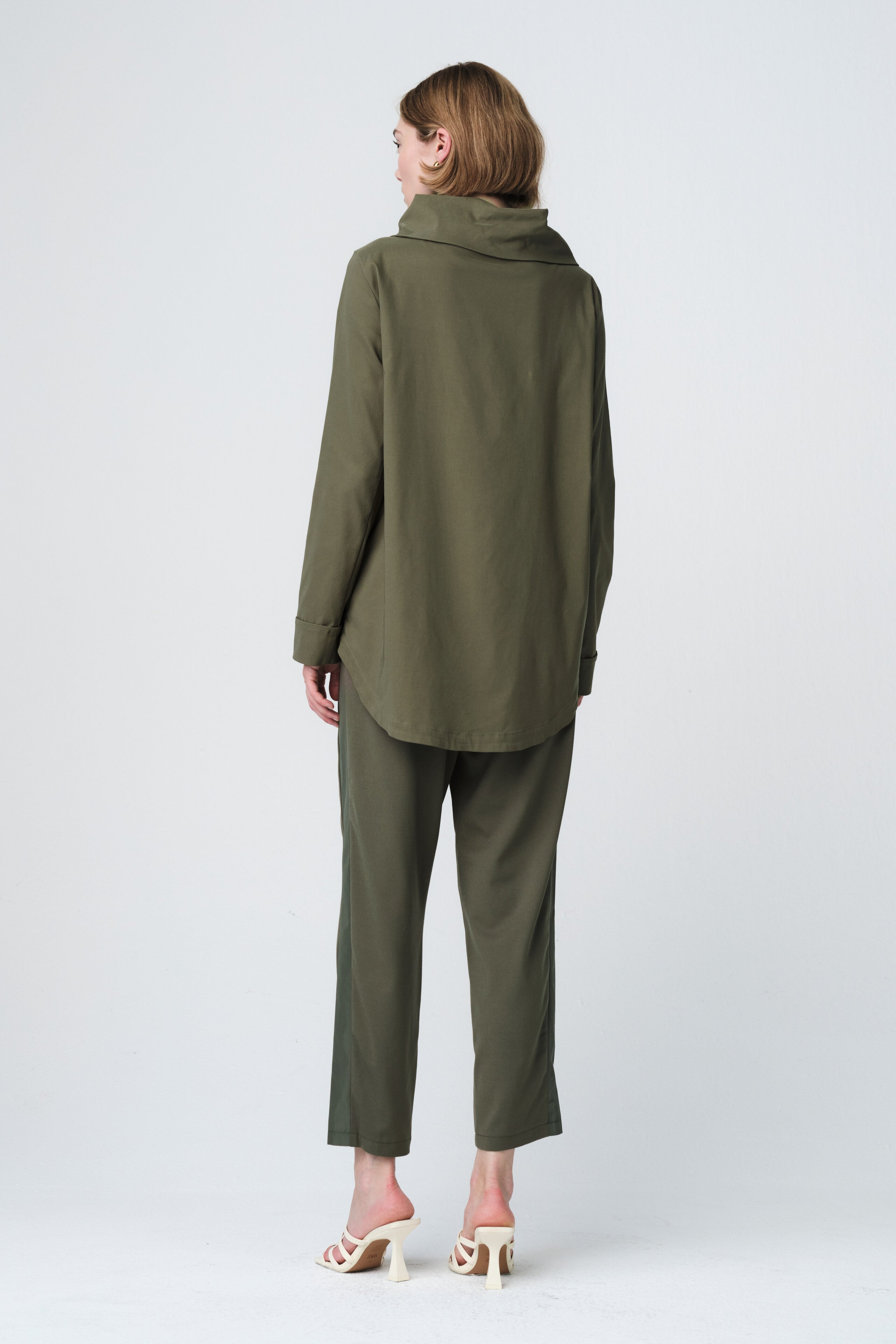 The Ken Top KS Technical Jersey by Jane Lushka is where sleek design meets high-performance fabric. Made in Bulgaria from the brand’s signature technical stretch jersey, this top offers a slim silhouette with exceptional comfort and flexibility. It features a small front keyhole detail, a soft stand collar, and ¾ sleeves for an elegant yet modern look. Perfect for both professional and casual settings, it’s a sophisticated essential that feels as good as it looks.