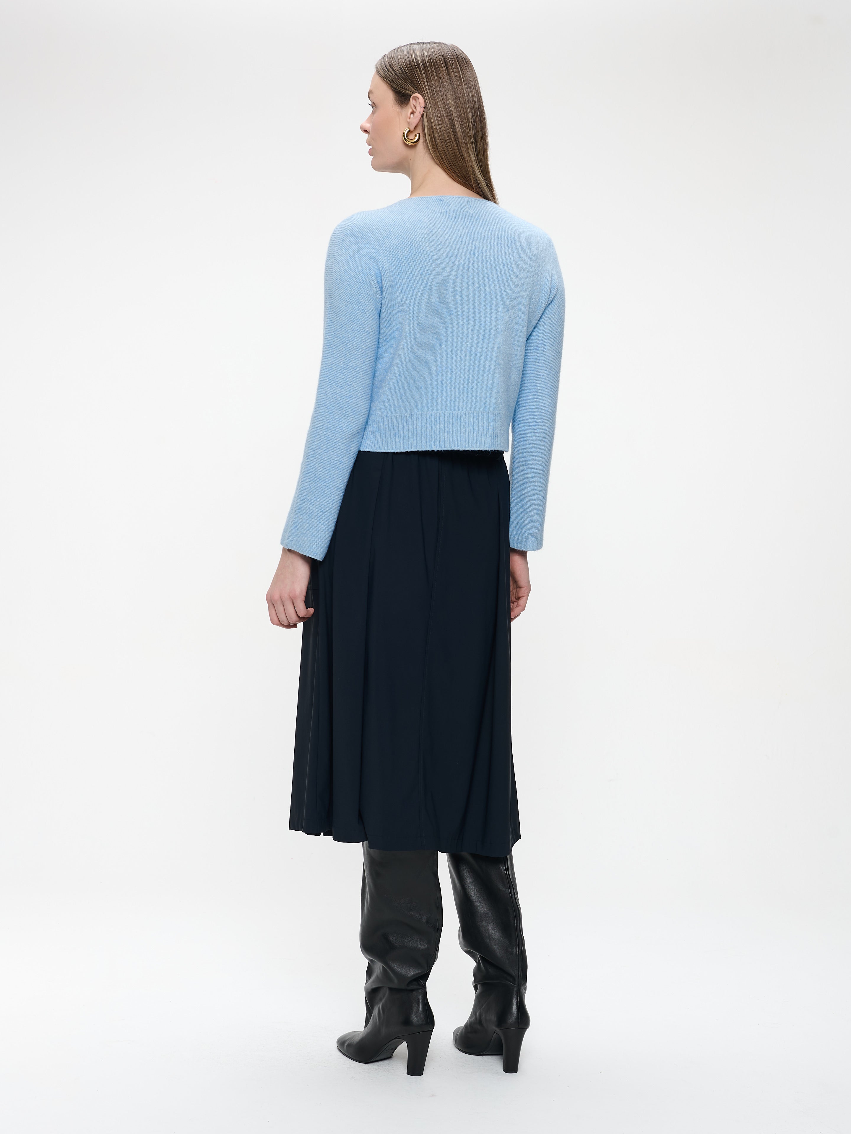 A-line denim Mishele skirt that brings together structure and femininity. The stitched pleat details add visual interest and shape, while the mid-calf length and dark indigo color provide timeless elegance. Pair it with soft knitwear or tailored shirts for versatile styling throughout the season.