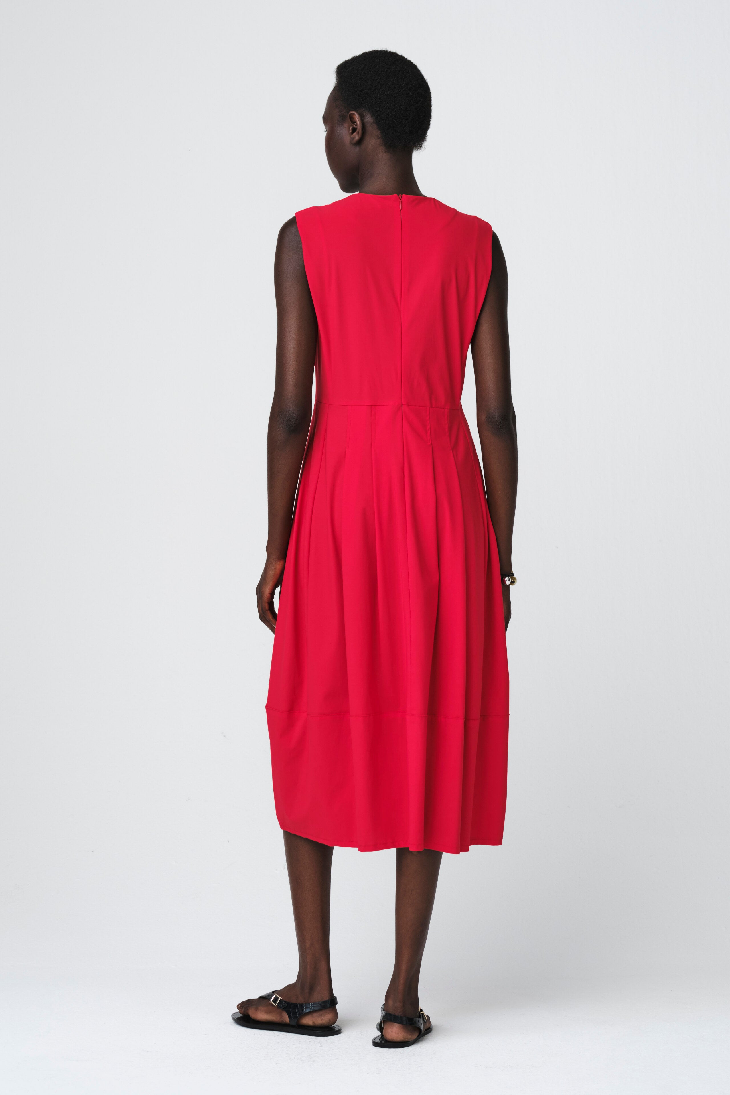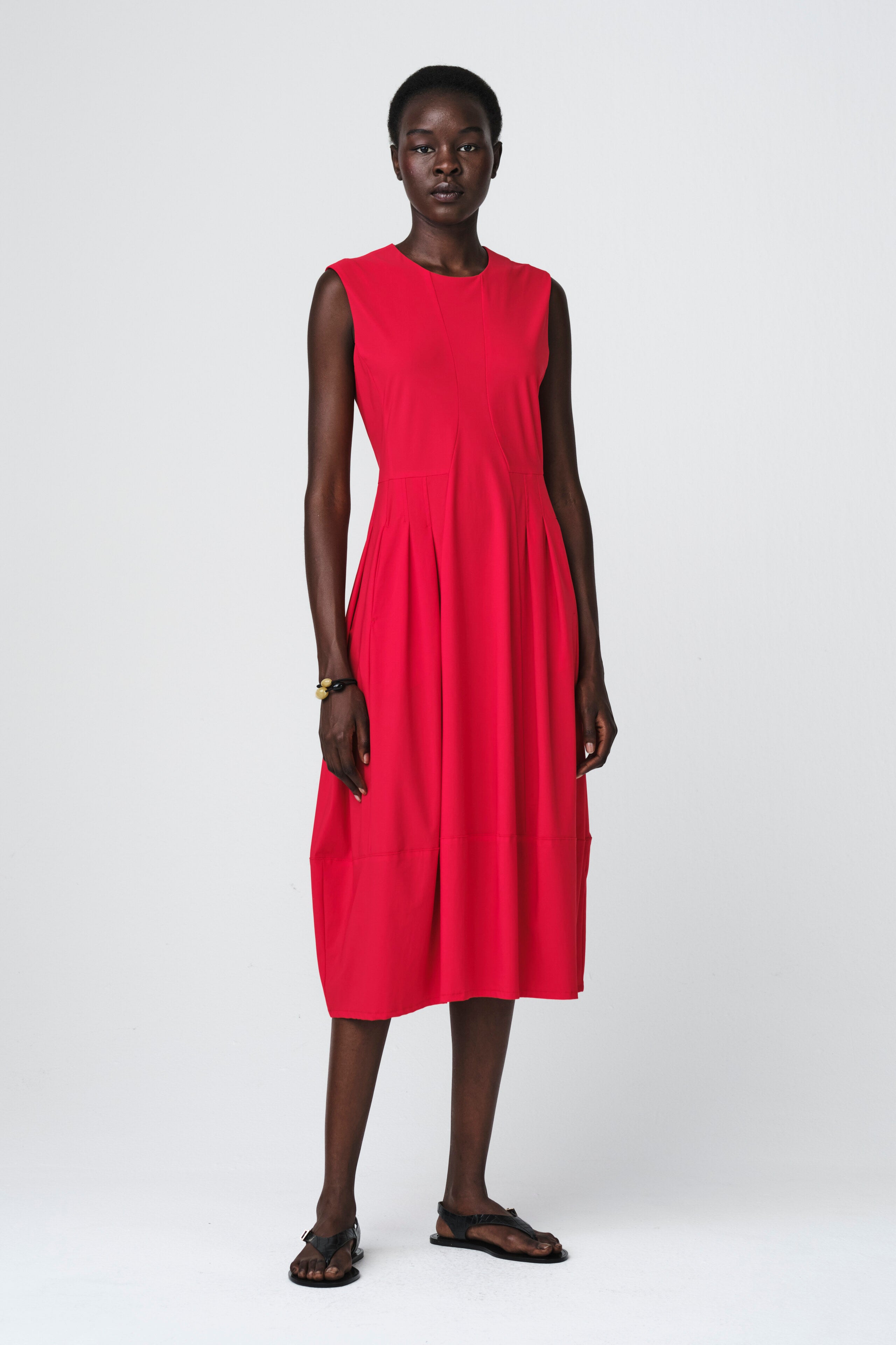 The Heide Dress Technical Jersey is a refined yet effortlessly comfortable piece. Crafted from soft technical jersey, it features a sleeveless silhouette with a round neckline and subtle pleats at the waist that create a flattering shape. Its midi length and relaxed fit make it ideal for everyday wear, while the side pockets add a touch of casual practicality. A versatile wardrobe essential that transitions easily from work to weekend.