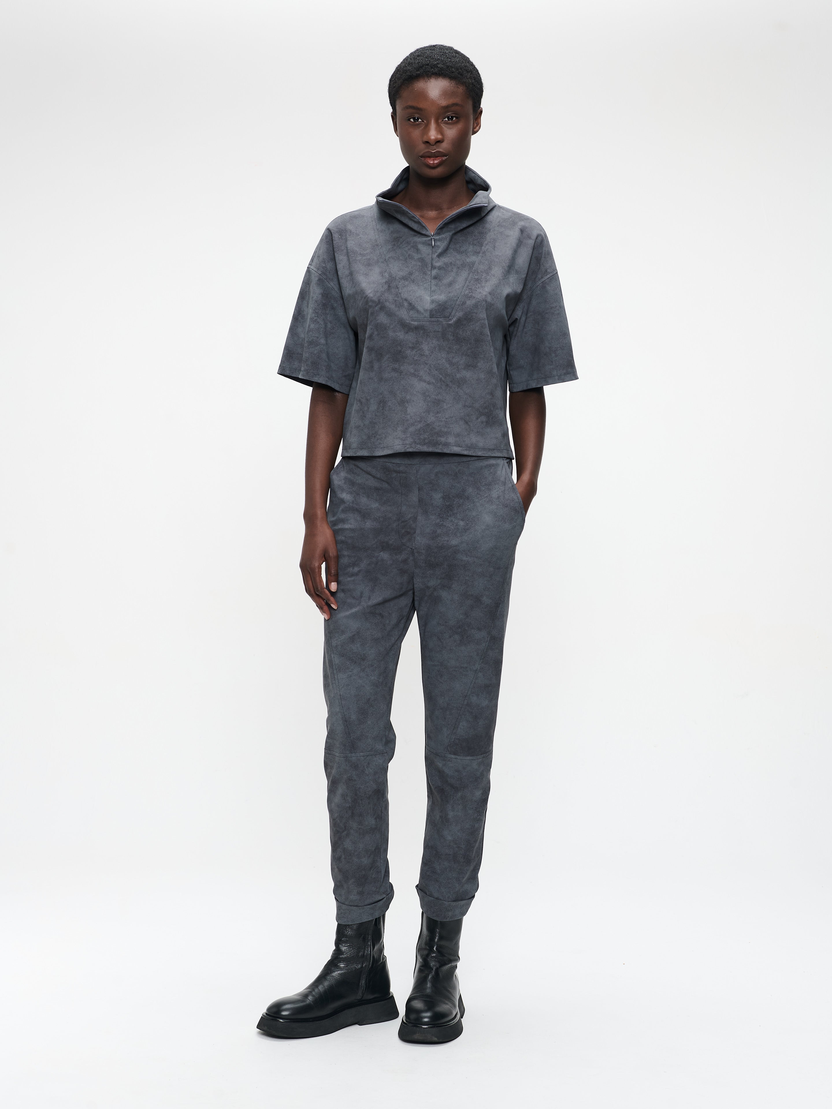 The Timelia Pants blend modern structure with cozy appeal. Cut from a soft technical jersey with suede-like texture, they feature a tapered leg and cuffed hems for a sleek yet relaxed silhouette. Ideal for cooler seasons, they offer both style and ease — perfect for pairing with matching tops or chunky knits.