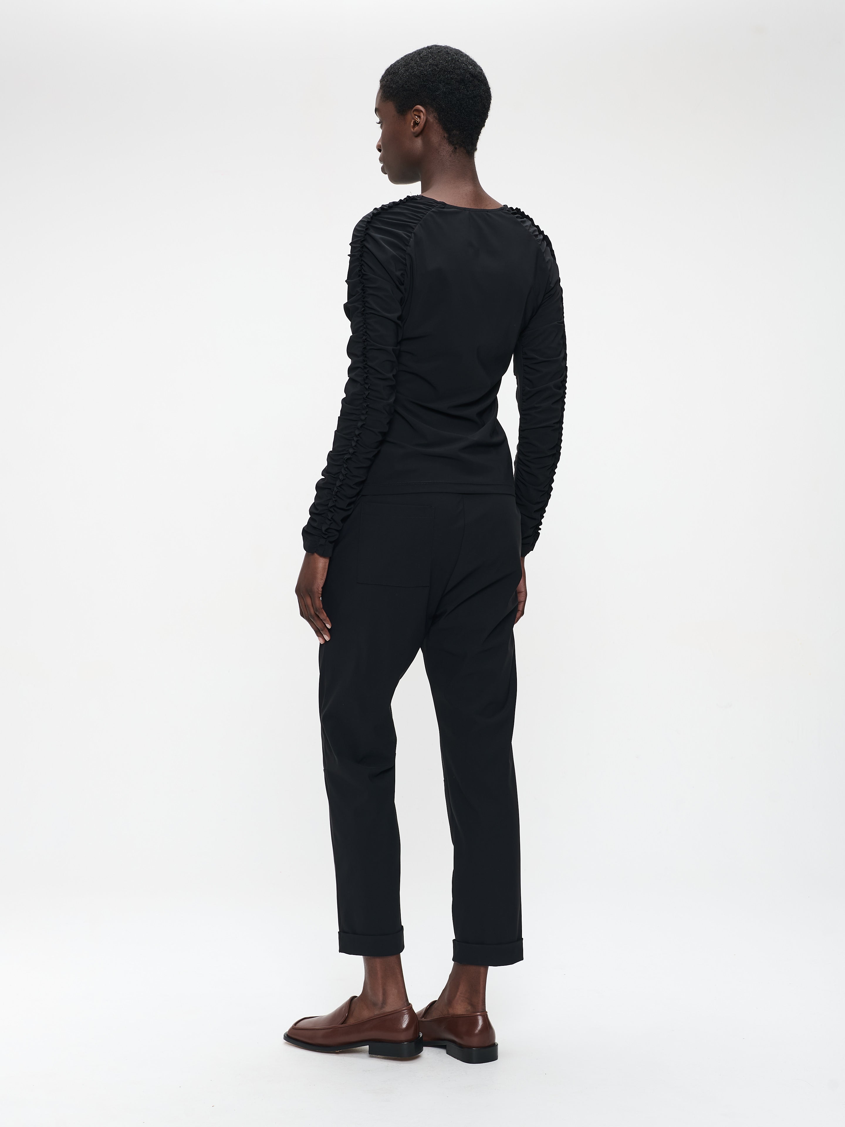 The Delia Pants strike the perfect balance between elegance and comfort. Made from brushed tech jersey with a suede-like touch, they feature cropped tapered legs finished with decorative buttoned cuffs. Their refined silhouette makes them a versatile wardrobe staple, ideal for work, travel, or evening looks.